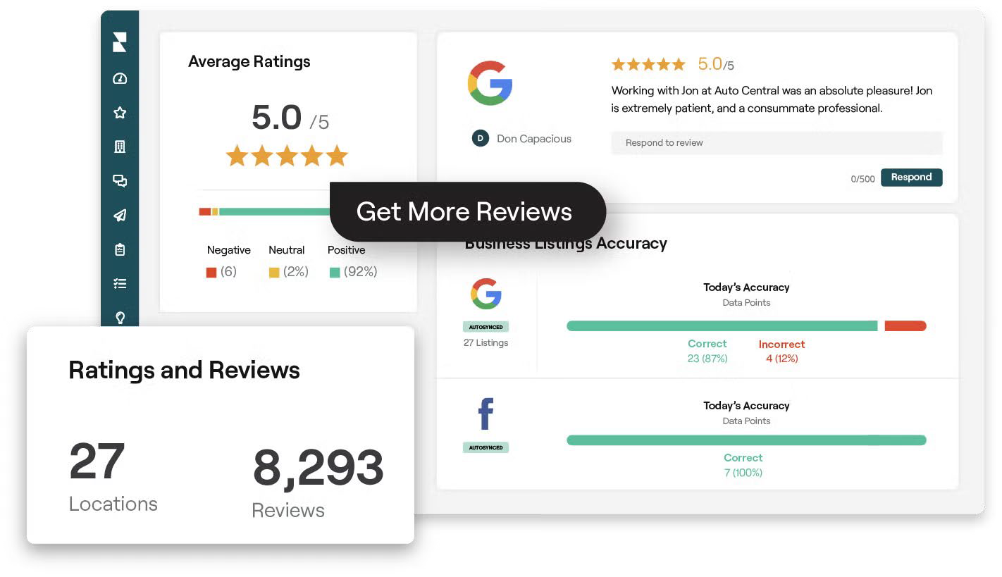 Monitor, respond to, and request reviews across Google, AllAgents, and more-all from a single dashboard. Automate responses with Al-powered templates that maintain brand voice, reduce staff workload, and keep responses consistent across platforms.